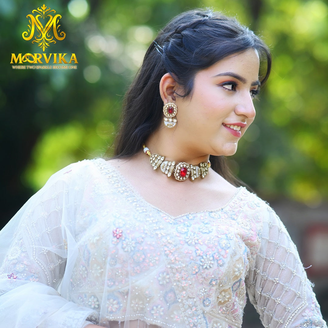 This exquisite Kundan necklace set showcases traditional craftsmanship with a contemporary edge. Hand-assembled with deep red polki stones and intricate antique gold work, each pear-shaped Kundan element is meticulously set to catch light and movement. The coordinating earrings complete a cohesive bridal or festive ensemble. Ideal for weddings, celebrations, and occasions demanding timeless elegance, this set bridges heritage artistry with modern design sensibilities. A versatile investment piece that transcends seasonal trends.